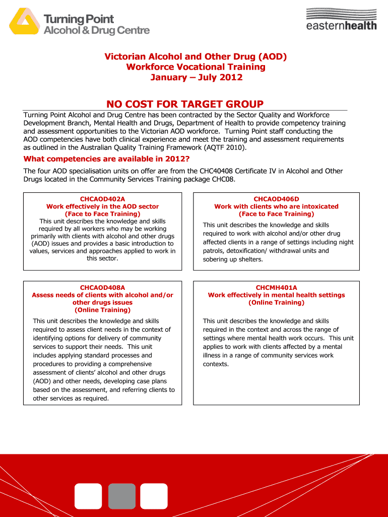 Victorian Alcohol and Other Drug (AOD) Workforce Vocational Training January July 2012 NO COST FOR TARGET GROUP Turning Point Alcohol and Drug Center has been contracted by the Sector Quality and