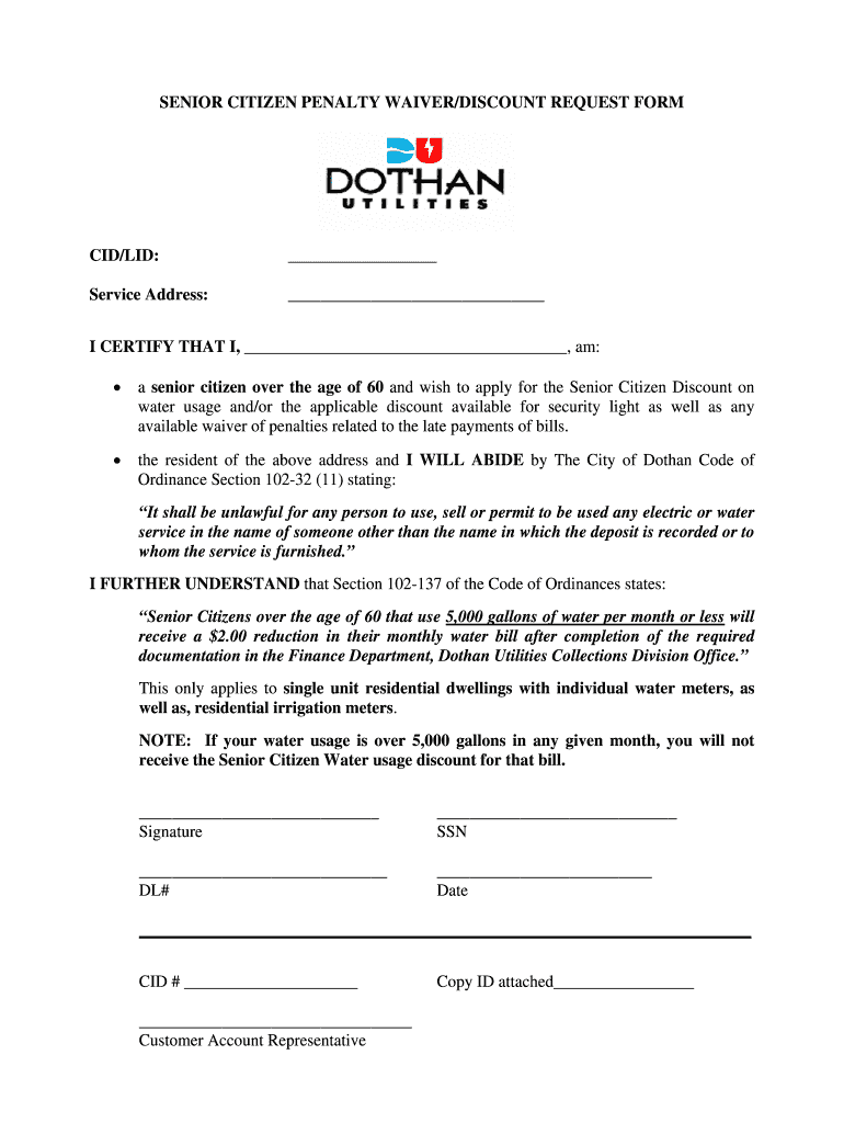 Get the free SENIOR CITIZEN PENALTY WAIVERDISCOUNT REQUEST FORM CID - dothan