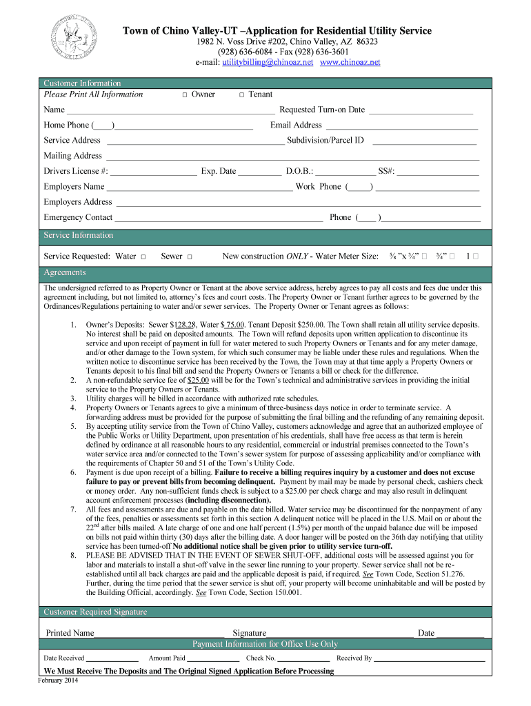 Town of Chino Valley UT Application for Residential Utility Service 1982 N. Loss Drive #202, Chino Valley, AZ 86323 (928) 6366084 Fax (928) 6363601 email: utility billing China.net www.chinoaz.net