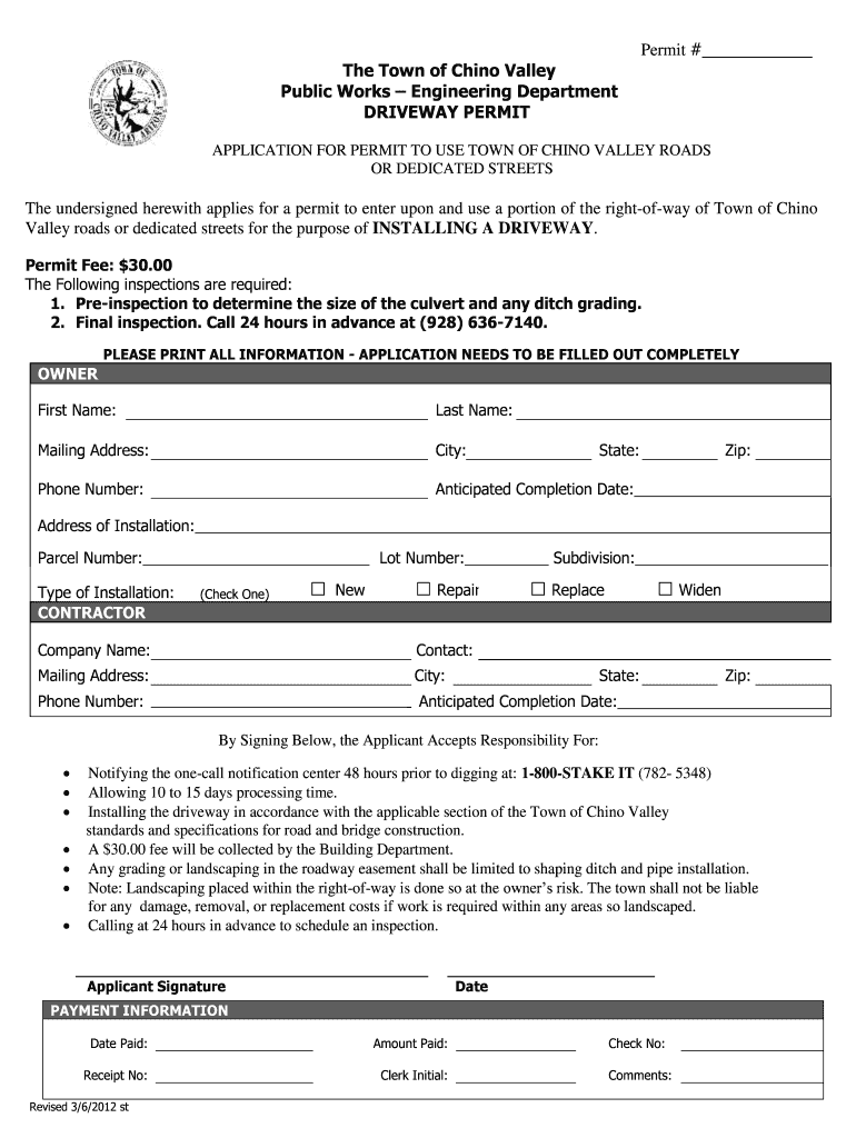 Permit # The Town of Chino Valley Public Works Engineering Department DRIVEWAY PERMIT APPLICATION FOR PERMIT Using TOWN OF CHINO VALLEY ROADS OR DEDICATED STREETS The undersigned herewith applies