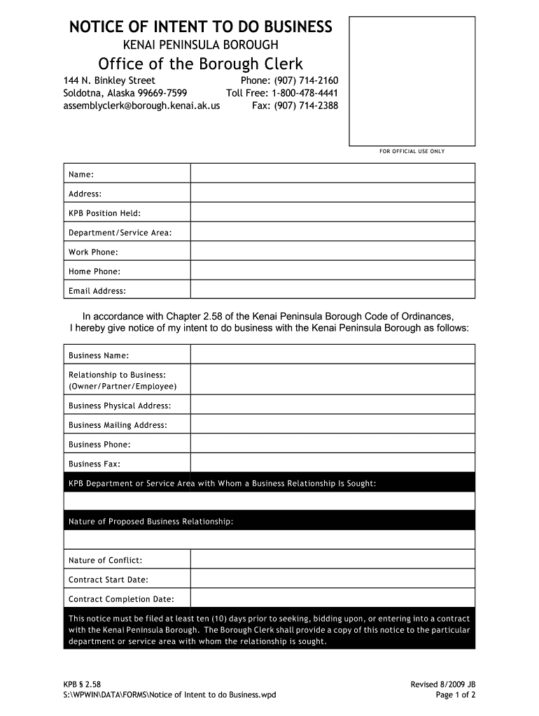 Get the free NOTICE OF INTENT TO DO BUSINESS - boroughkenaiakus - www2 borough kenai ak