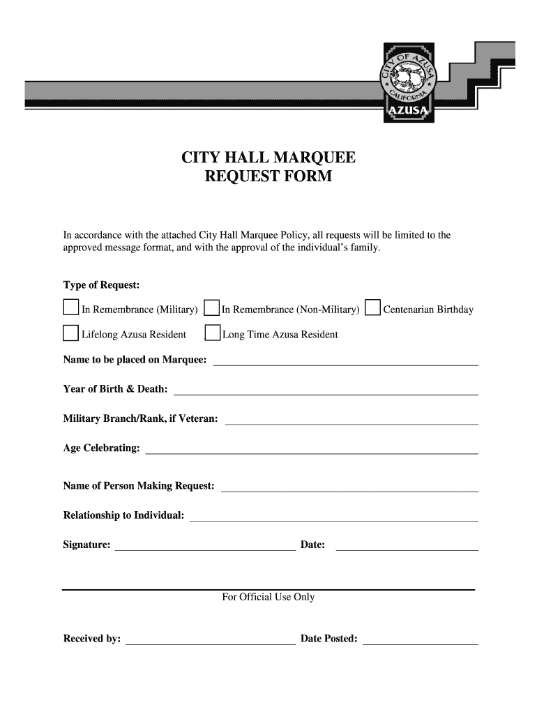 Get the free CITY HALL MARQUEE REQUEST FORM - Azusa