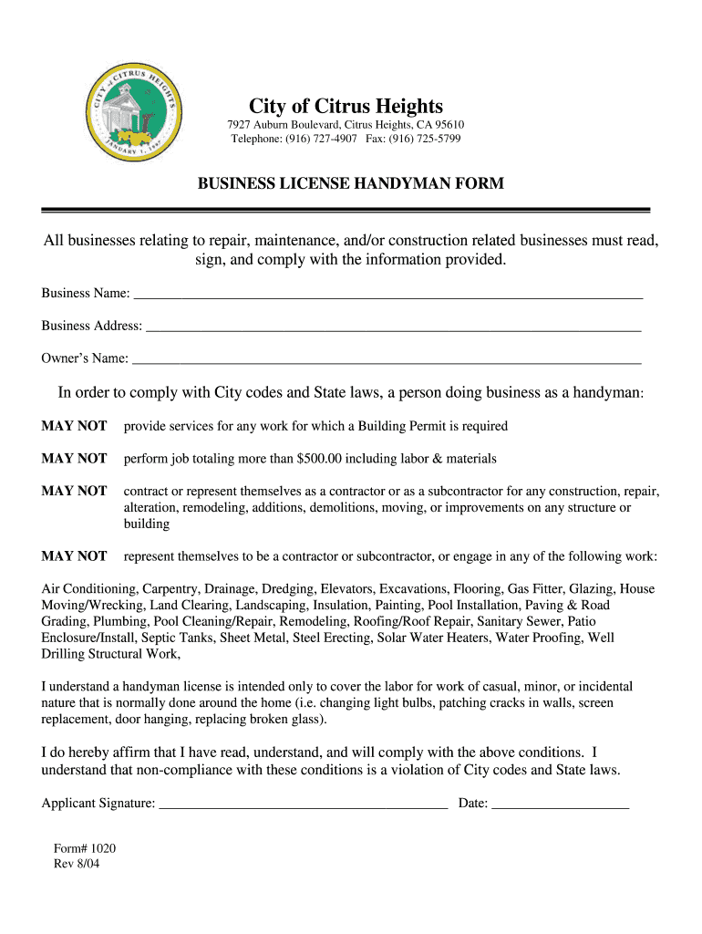 City of Citrus Heights 7927 Auburn Boulevard, Citrus Heights, CA 95610 Telephone: (916) 7274907 Fax: (916) 7255799 BUSINESS LICENSE HANDYMAN FORM All businesses relating to repair, maintenance, and/or