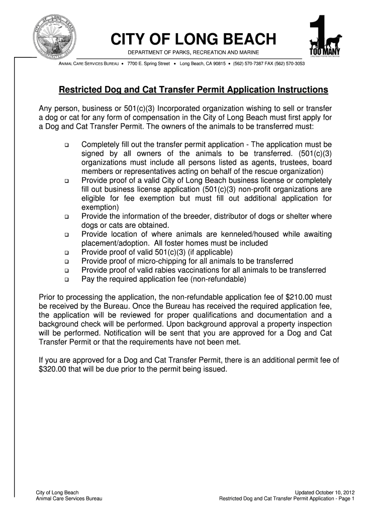 CITY OF LONG BEACH DEPARTMENT OF PARKS, RECREATION AND MARINE ANIMAL CARE SERVICES BUREAU 7700 E. Spring Street Long Beach, CA 90815 (562) 5707387 FAX (562) 5703053 Restricted Dog and Cat Transfer