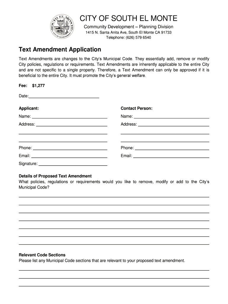CITY OF SOUTH EL MONTE Community Development Planning Division 1415 N. Santa Anita Ave, South El Monte CA 91733 Telephone: (626) 579 6540 Text Amendment Application Text Amendments are changes to