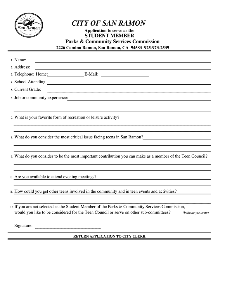 CITY OF SAN RAMON Application to serve as the STUDENT MEMBER Parks & Community Services Commission 2226 Camino Ramon, San Ramon, CA 94583 9259732539 1. Name: 2. Address: 3. Telephone: Home: 4. School