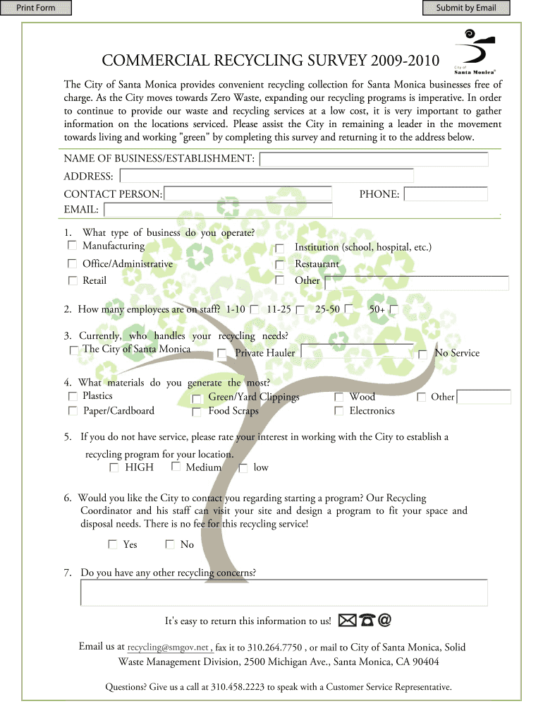 Print Form Submit by Email COMMERCIAL RECYCLING SURVEY 20092010 The City of Santa Monica provides convenient recycling collection for Santa Monica businesses free of charge. As the City moves towards