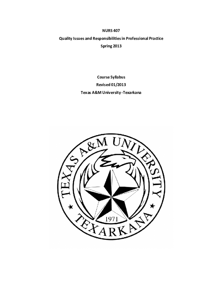 This document serves as a syllabus for the NURS 407 course, outlining the course structure, objectives, evaluation methods, and relevant policies at Texas A&M University-Texarkana for the Spring 2013
