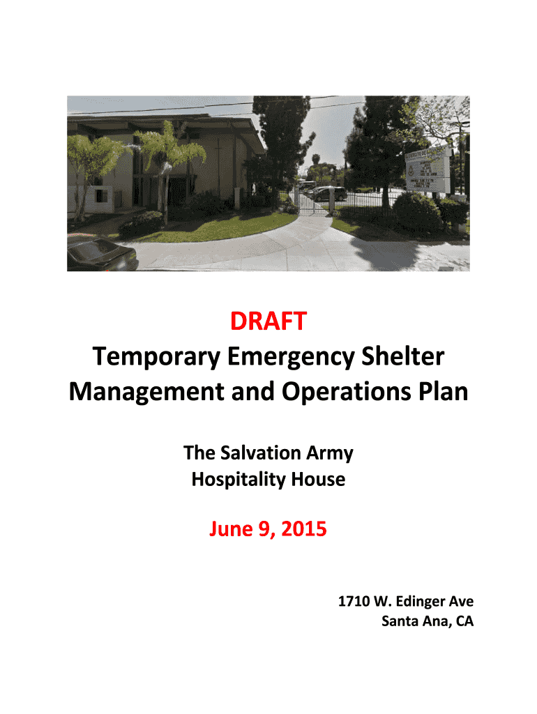 DRAFT Temporary Emergency Shelter Management and Operations Plan The Salvation Army Hospitality House June 9, 2015 1710 W. Singer Ave Santa Ana, CA DRAFT June 9, 2015, Table of Contents SECTION I.