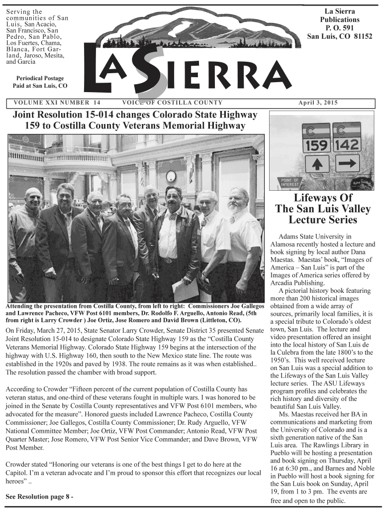 Serving the communities of San Luis, San Acacia, San Francisco, San Pedro, San Pablo, Los Fuentes, Champ, Blanca, Fort Garland, Arose, Media, and Garcia Periodical Postage Paid at San Luis, CO LS