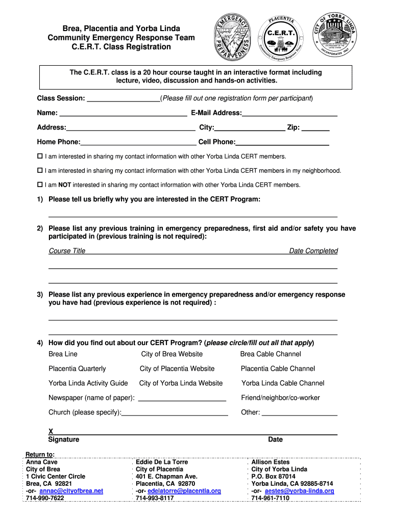 Area, Placenta and Yorba Linda Community Emergency Response Team C.E.R.T. Class Registration The C.E.R.T. class is a 20-hour course taught in an interactive format including lecture, video, discussion