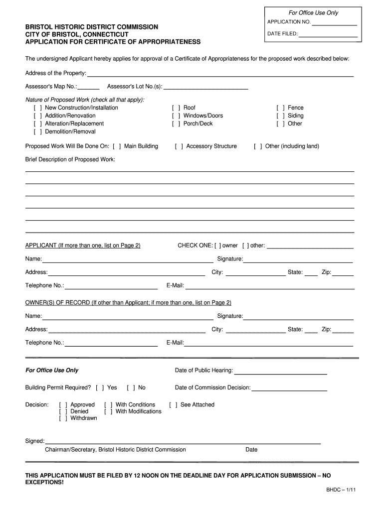 Click here to PRINT this form Click here to view TIPS for filling out this form For Office Use Only APPLICATION NO. BRISTOL HISTORIC DISTRICT COMMISSION CITY OF BRISTOL, CONNECTICUT APPLICATION FOR