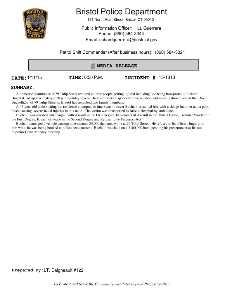 Bristol Police Department 131 North Main Street, Bristol, CT 06010 Public Information Officer: Lt. Guerrero Phone: (860) 5843044 Email: richardguerrera Bristol.gov Patrol Shift Commander (After business