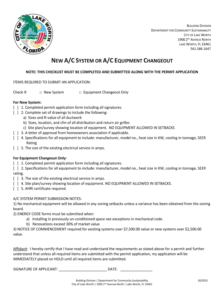 BUILDING DIVISION DEPARTMENT FOR COMMUNITY SUSTAINABILITY CITY OF LAKE WORTH 1900 2ND AVENUE NORTH LAKE WORTH, FL 33461 561.586.1647 NEW A/C SYSTEM OR A/C EQUIPMENT HANGOUT NOTE: THIS CHECKLIST MUST