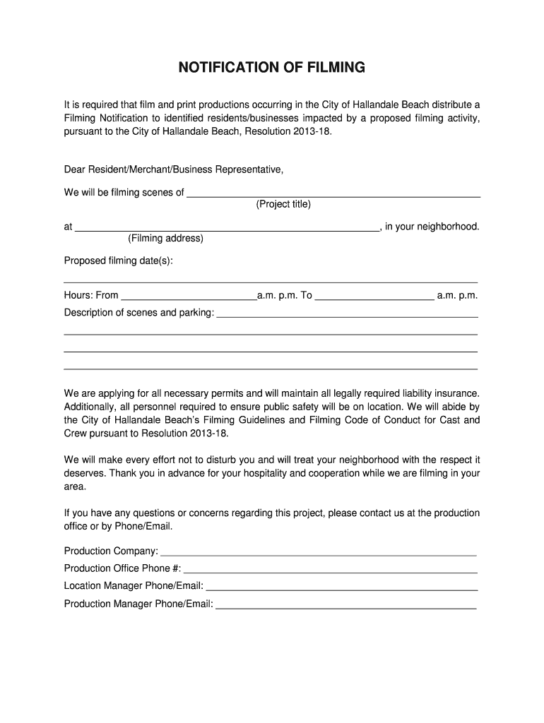 Get the free NOTIFICATION OF FILMING - hallandalebeachflgov