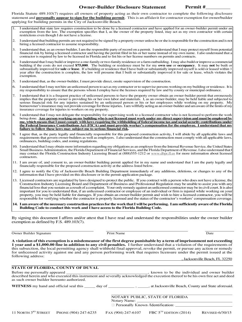 Get the free Owner-Builder Disclosure Statement Permit - jacksonvillebeach