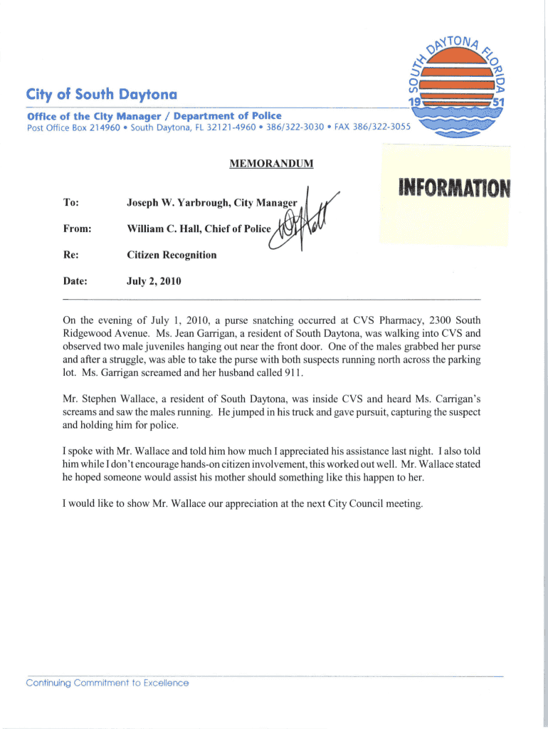 City of South Daytona Office of the City Manager / Department of Police Post Office Box 214960 South Daytona, FL 321214960 386/3223030 FAX 386/3223055 MEMORANDUM To: Joseph W. Yarbrough, City Manager