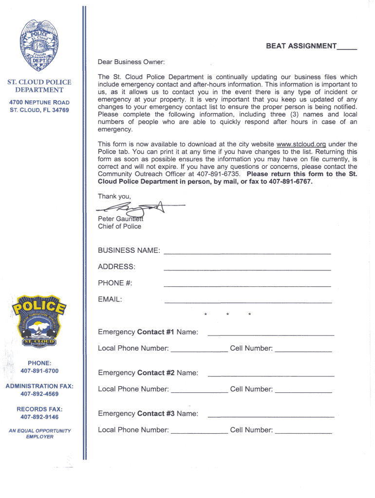 BEAT ASSIGNMENT Dear Business Owner: ST. CLOUD POLICE DEPARTMENT 4700 NEPTUNE ROAD ST. CLOUD, FL 34769 The St. Cloud Police Department is continually updating our business files which include emergency