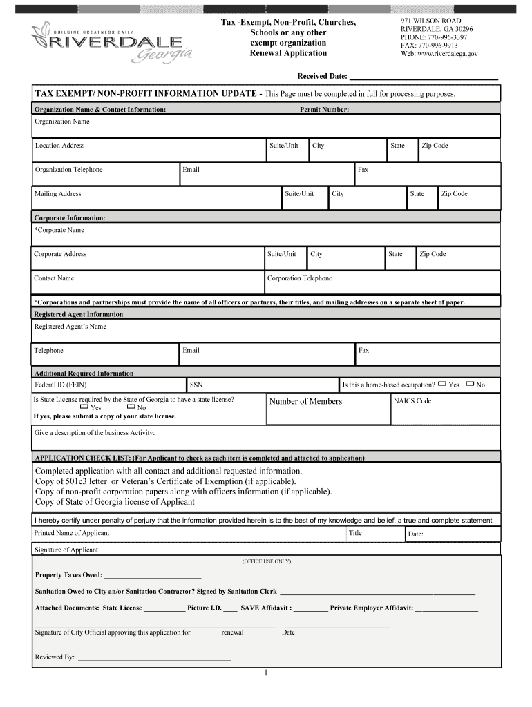 971 WILSON ROAD RIVERDALE, GA 30296 PHONE: 7709963397 FAX: 7709969913 Web: www.riverdalega.gov Tax Exempt, Nonprofit, Churches, Schools or any other exempt organization Renewal Application Received