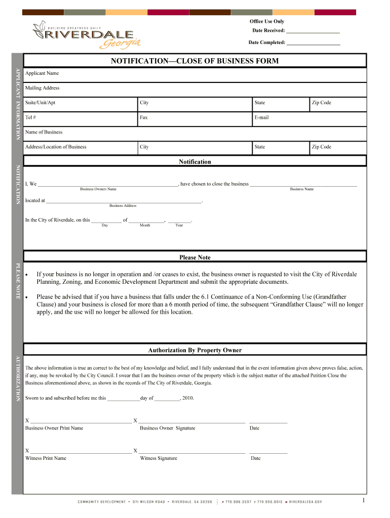 Get the free NOTIFICATION CLOSE OF BUSINESS FORM - riverdalegagov