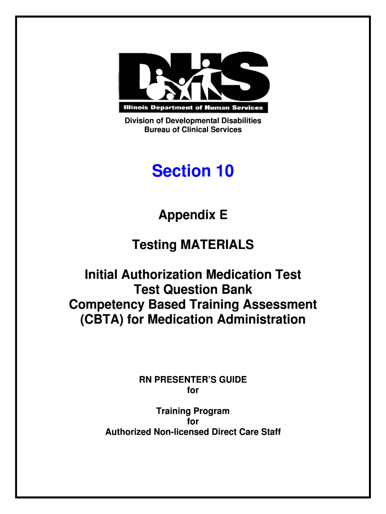 Division of Developmental Disabilities Bureau of Clinical Services Section 10 Appendix E Testing MATERIALS Initial Authorization Medication Test Question Bank Competency Based Training Assessment