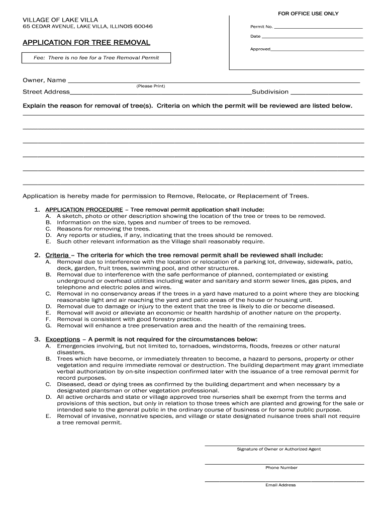 FOR OFFICE USE ONLY VILLAGE OF LAKE VILLA 65 CEDAR AVENUE, LAKE VILLA, ILLINOIS 60046 APPLICATION FOR TREE REMOVAL Permit No. Date Approved Fee: There is no fee for a Tree Removal Permit Owner, Name