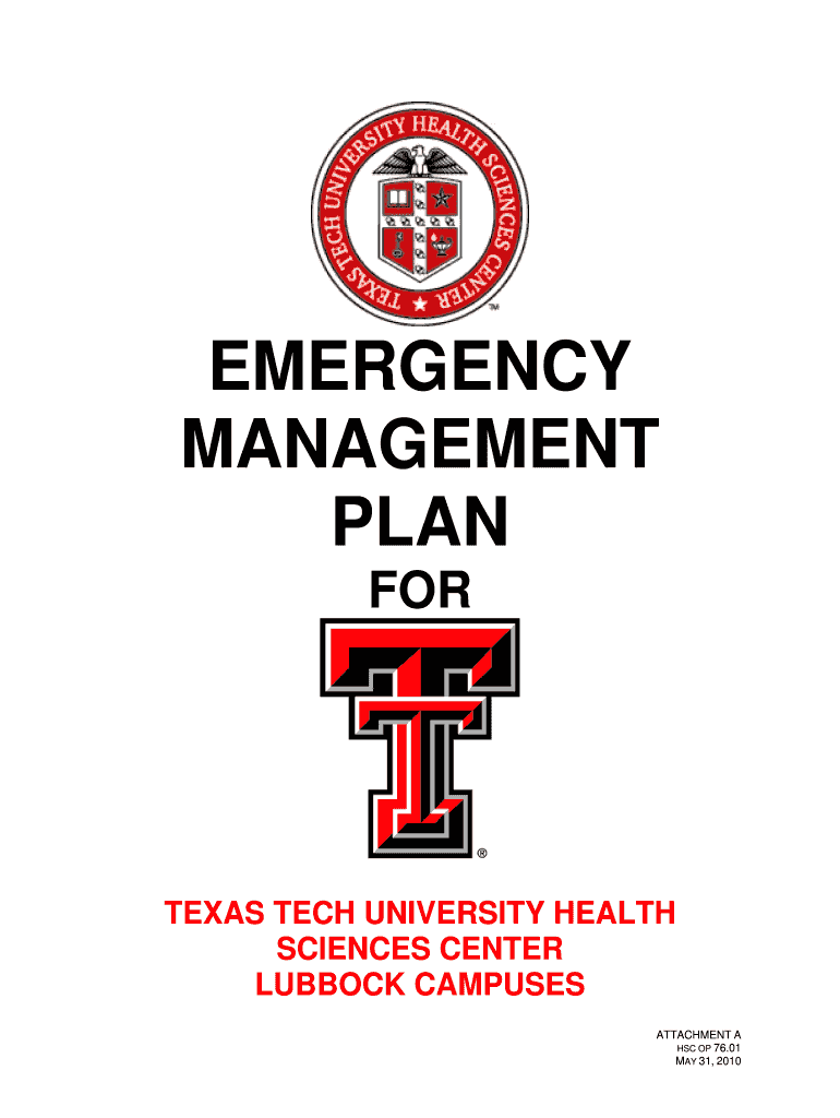 This document outlines the emergency management plan for Texas Tech University Health Sciences Center, focusing on policies, procedures, and responsibilities for effective emergency response, recovery,