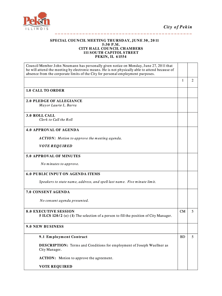 City of Peking SPECIAL COUNCIL MEETING THURSDAY, JUNE 30, 2011 5:30 P.M. CITY HALL COUNCIL CHAMBERS 111 SOUTH CAPITOL STREET PEKING, IL 61554 Council Member John Neumann has personally given notice