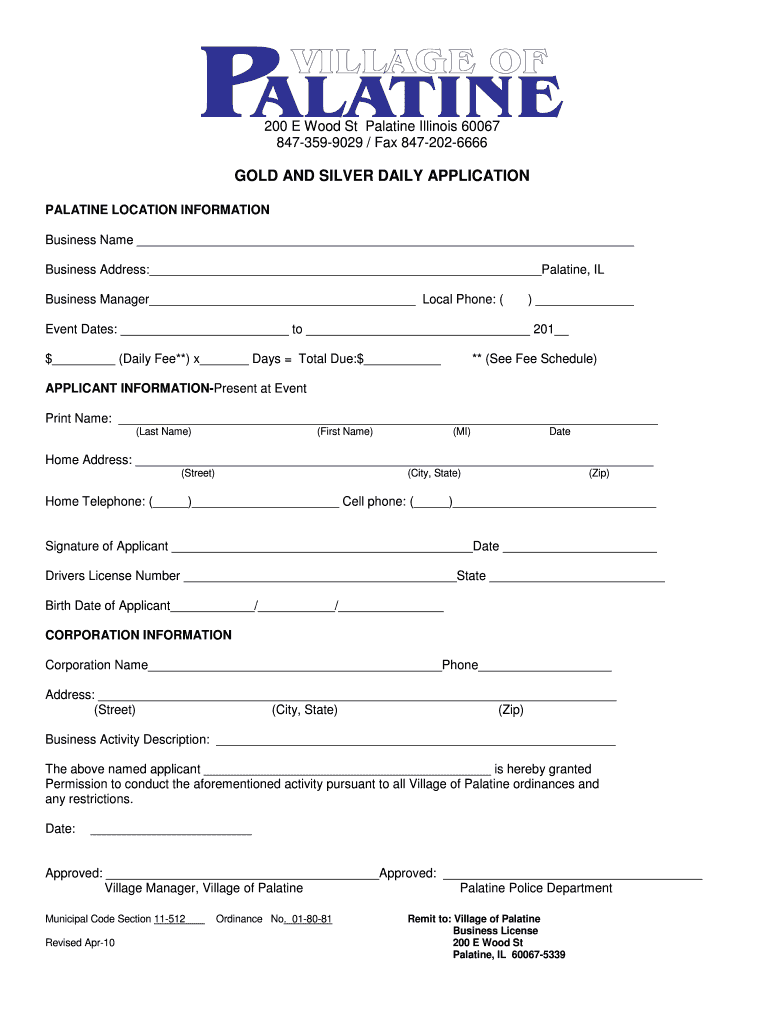 200 E Wood St Palatine Illinois 60067 8473599029 / Fax 8472026666 GOLD AND SILVER DAILY APPLICATION PALATINE LOCATION INFORMATION Business Name Business Address: Palatine, IL Business Manager Local