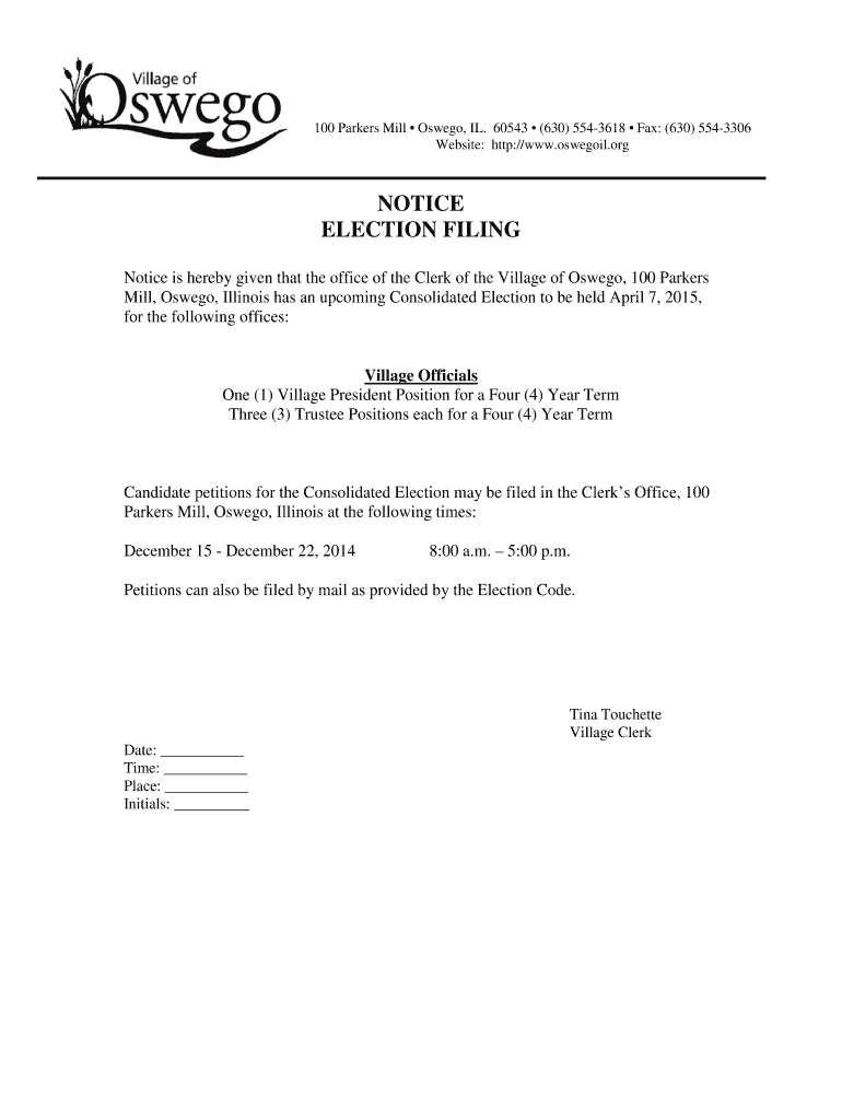 Get the free NOTICE ELECTION FILING - Oswego Illinois - oswegoil