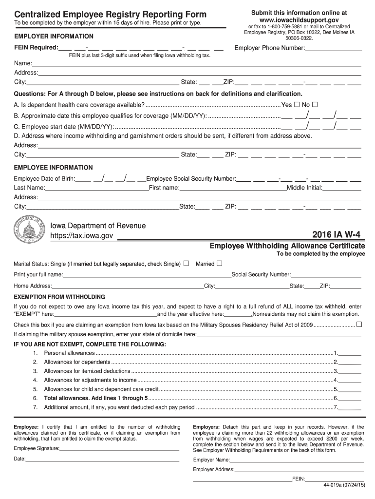 Submit this information online at www.iowachildsupport.gov Centralized Employee Registry Reporting Form To be completed by the employer within 15 days of hire. Please print or type. Or fax to 18007595881