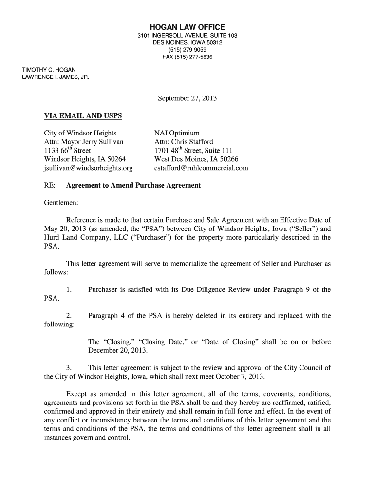HOGAN LAW OFFICE 3101 INGERSOLL AVENUE, SUITE 103 DES MOINES, IOWA 50312 (515) 2799059 FAX (515) 2775836 TIMOTHY C. HOGAN LAWRENCE I. JAMES, JR. September 27, 2013, VIA EMAIL AND USPS City of Windsor