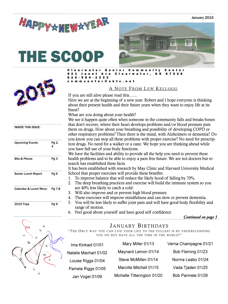 January 2015 THE SCOOP C 9 6 c l 2 2 o e an r w a t 1 J an n e 0 5 8 4 m c e n e r S e n i o r C o m m u n i t y t A v e C l e an r w a t e r, K S 2 3 3 2 t e r s k t c. n e t C e n t e r 6 7 0 2
