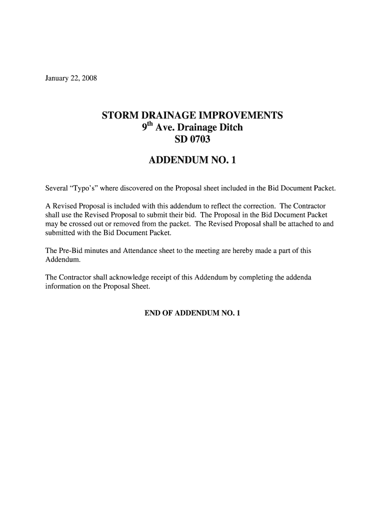 January 22, 2008, STORM DRAINAGE IMPROVEMENTS 9th Ave. Drainage Ditch SD 0703 ADDENDUM NO. 1 Several Typos where discovered on the Proposal sheet included in the Bid Document Packet. A Revised Proposal