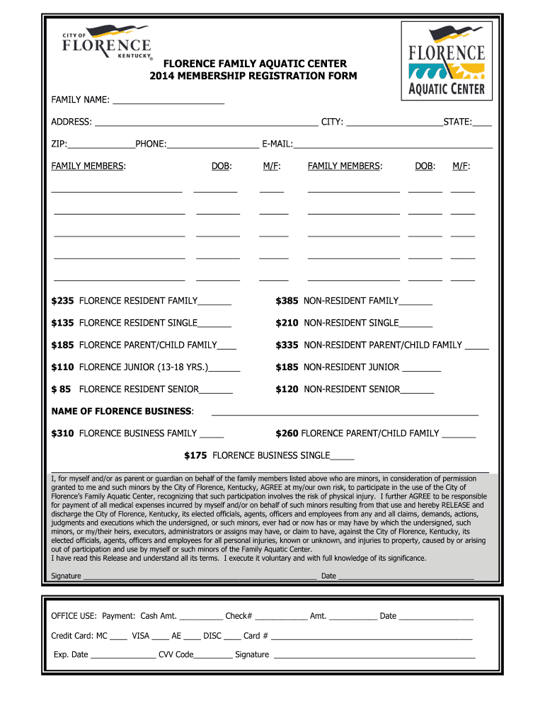 FLORENCE FAMILY AQUATIC CENTER 2014 MEMBERSHIP REGISTRATION FORM FAMILY NAME: ADDRESS: CITY: STATE: ZIP: PHONE: EMAIL: FAMILY MEMBERS: DOB: M/F: FAMILY MEMBERS: DOB: M/F: $235 FLORENCE RESIDENT FAMILY