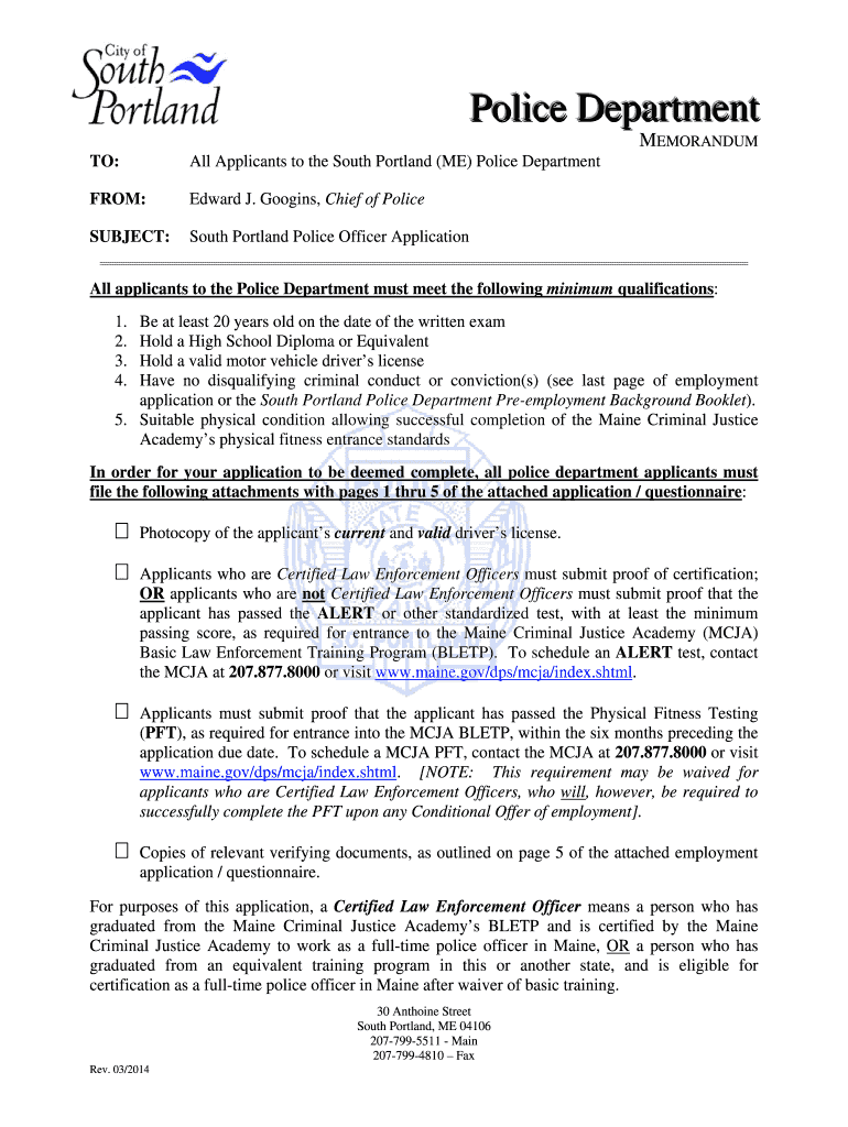 Police Department MEMORANDUM TO: All Applicants to the South Portland (ME) Police Department FROM: Edward J. Goo gins, Chief of Police SUBJECT: South Portland Police Officer Application All applicants