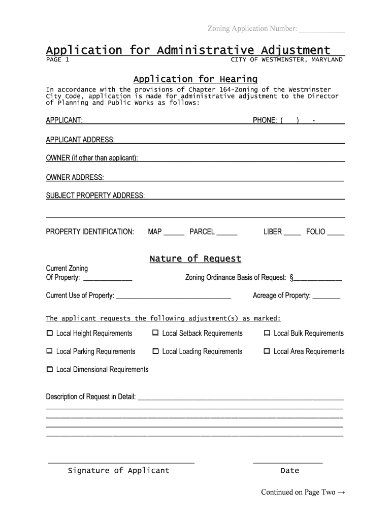 Application for Administrative Adjustment PAGE 2 CITY OF WESTMINSTER, MARYLAND APPLICANT: ADJOINING (CONTIGUOUS) PROPERTY ...