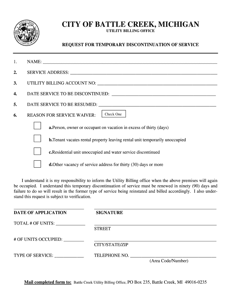 CITY OF BATTLE CREEK, MICHIGAN UTILITY BILLING OFFICE REQUEST FOR TEMPORARY DISCONTINUATION OF SERVICE 1. NAME: 2. SERVICE ADDRESS: 3. UTILITY BILLING ACCOUNT NO: 4. DATE SERVICE TO BE DISCONTINUED: