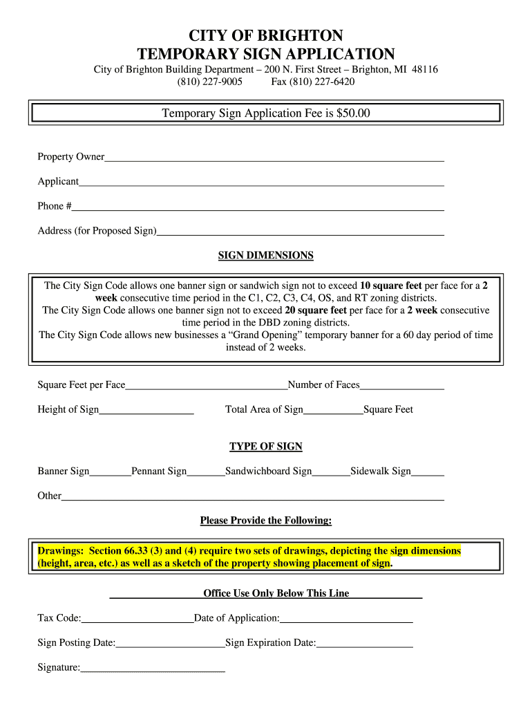 CITY OF BRIGHTON TEMPORARY SIGN APPLICATION City of Brighton Building Department 200 N. First Street Brighton, MI 48116 (810) 2279005 Fax (810) 2276420 Temporary Sign Application Fee is $50.00 Property
