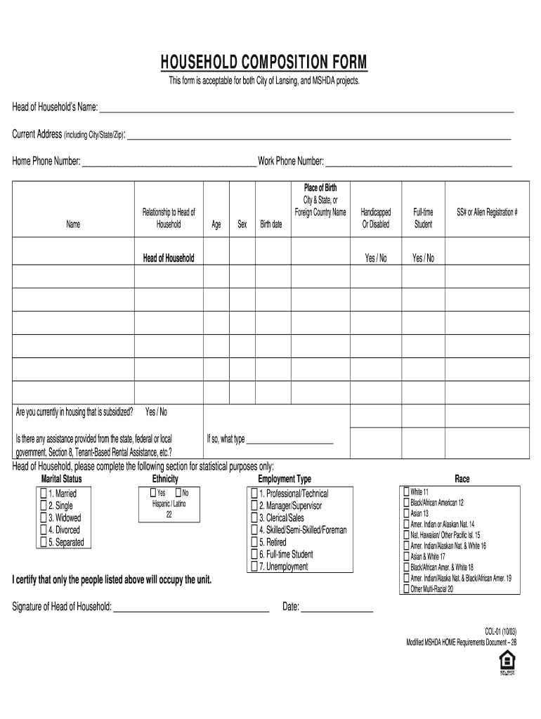 HOUSEHOLD COMPOSITION From This form is acceptable for both City of Lansing, and MSH DA projects. Head of Households Name: Current Address (including City/State/Zip): Home Phone Number: Work Phone