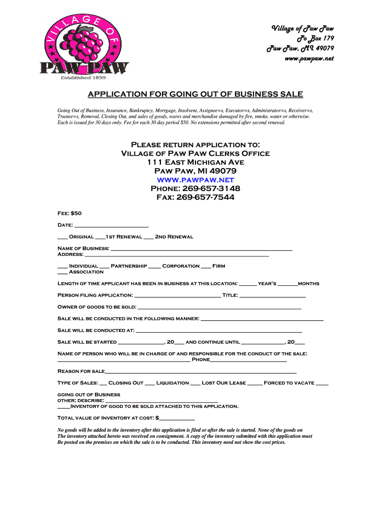 Village of Paw Paw Po Box 179 Paw Paw, MI 49079 www.pawpaw.net APPLICATION FOR GOING OUT OF BUSINESS SALE Going Out of Business, Insurance, Bankruptcy, Mortgage, Insolvent, Assignees, Executors, Administrators,