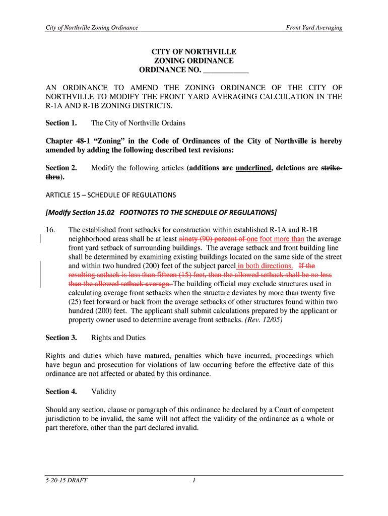 City of Northville Zoning Ordinance Front Yard Averaging CITY OF NORTHVILLE ZONING ORDINANCE NO. AN ORDINANCE TO AMEND THE ZONING ORDINANCE OF THE CITY OF NORTHVILLE TO MODIFY THE FRONT YARD AVERAGING