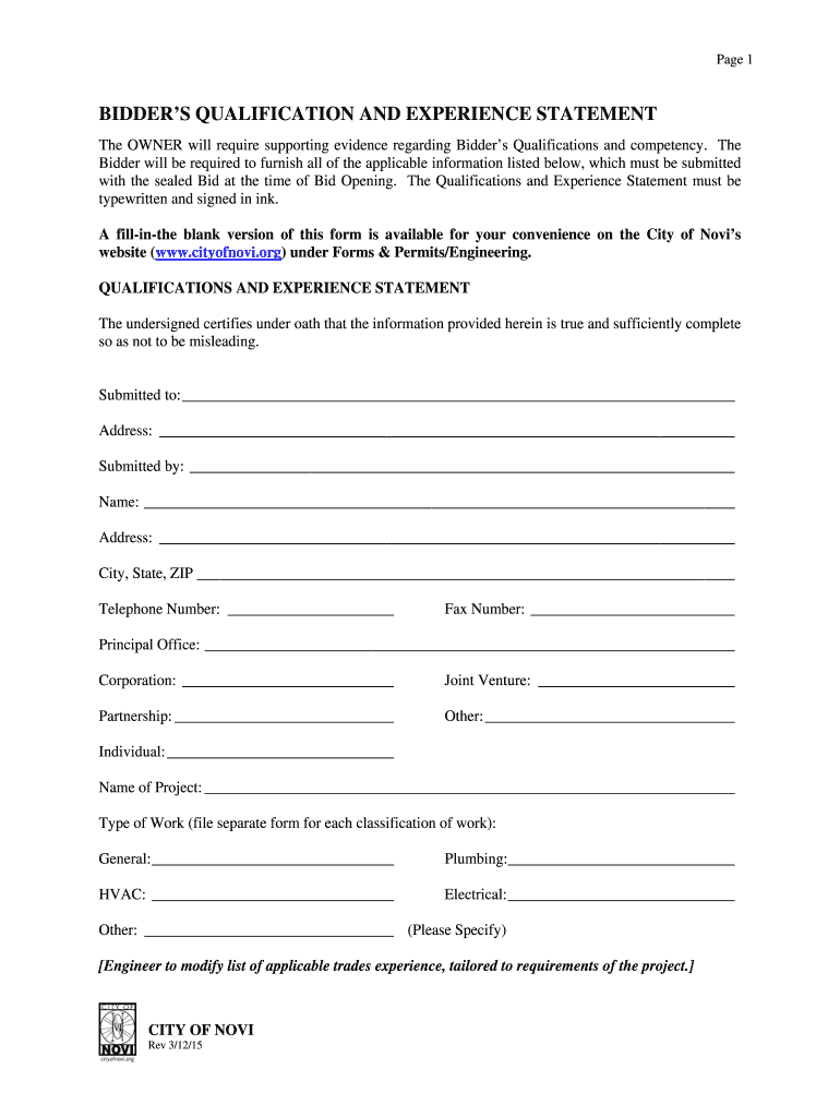 Get the free Bidders Qualification and Experience Statement - cityofnovi