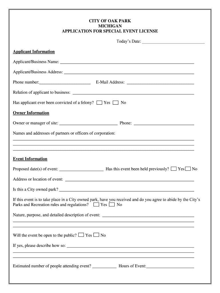 CITY OF OAK PARK MICHIGAN APPLICATION FOR SPECIAL EVENT LICENSE Today's Date: Applicant Information Applicant/Business Name: Applicant/Business Address: Phone number: Email Address: Relation of applicant