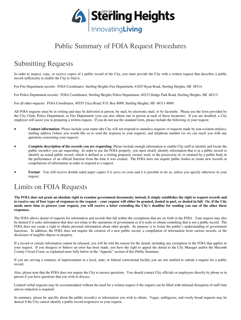 Get the free Public Summary of FOIA Request Procedures Submitting Requests - sterling-heights