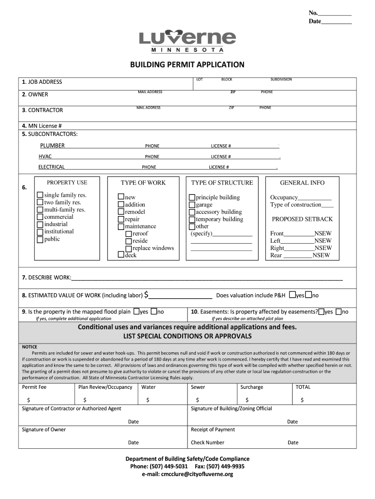 No. Date BUILDING PERMIT APPLICATION LOT 1. JOB ADDRESS BLOCK ZIP MAIL ADDRESS 2. OWNER MAIL ADDRESS 3. CONTRACTOR SUBDIVISION PHONE ZIP PHONE 4. MN License # 5. SUBCONTRACTORS: PLUMBER PHONE HVAC