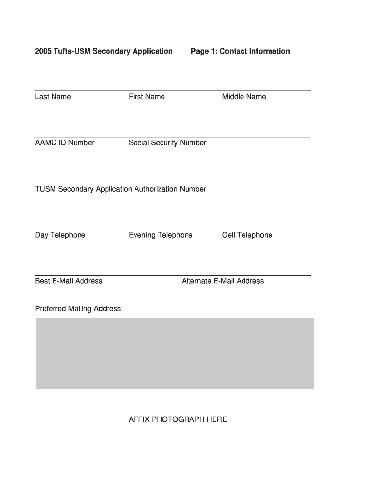 Information required on the 2005 Tufts-USM Secondary Application includes personal identification details, educational history, relevant work and volunteer experiences, personal statements, and any additional materials requested by the admissions committee.