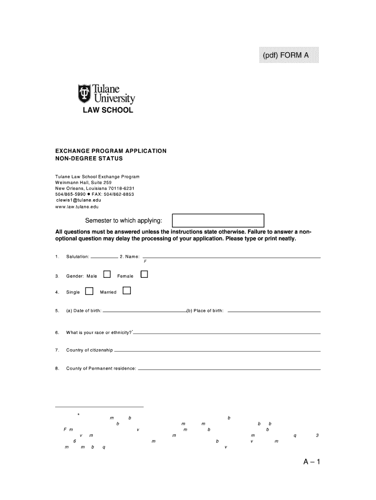 This document serves as an application form for students seeking to participate in the Tulane Law School Exchange Program under non-degree status. It collects personal, educational, and demographic
