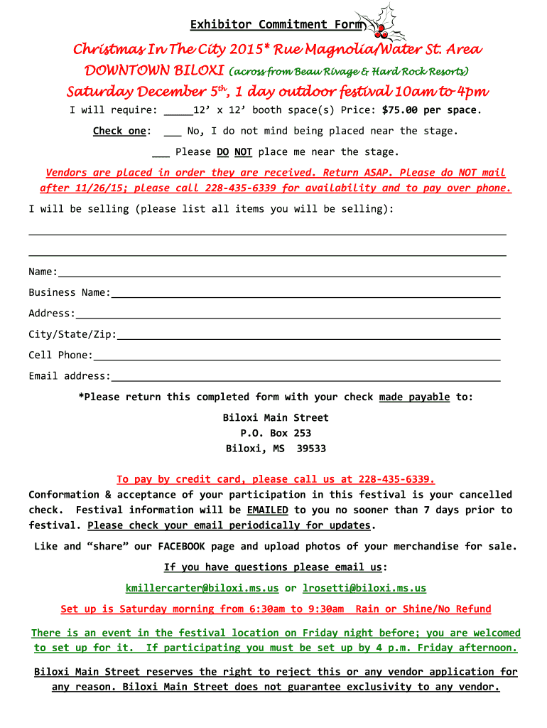 Exhibitor Commitment Form Christmas In The City 2015* Rue Magnolia/Water St. Area DOWNTOWN BILOXI (across from Beau Ravage & Hard Rock Resorts) Saturday, December 5th, 1 day outdoor festival 10am