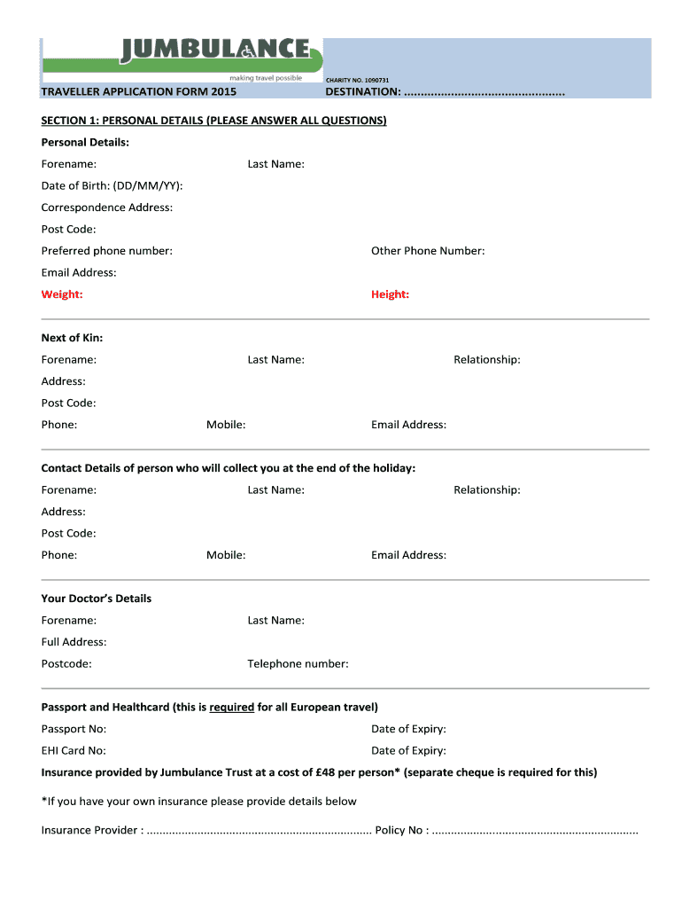 CHARITY NO. 1090731 Traveler APPLICATION FORM 2015 DESTINATION: ................................................ SECTION 1: PERSONAL DETAILS (PLEASE ANSWER ALL QUESTIONS) Personal Details: Forename: